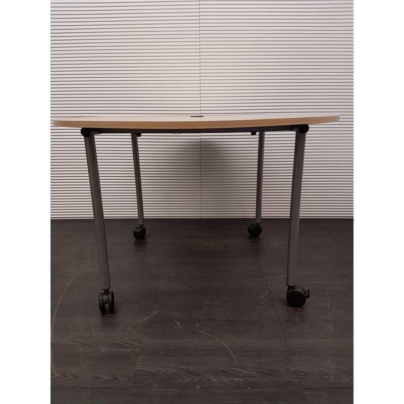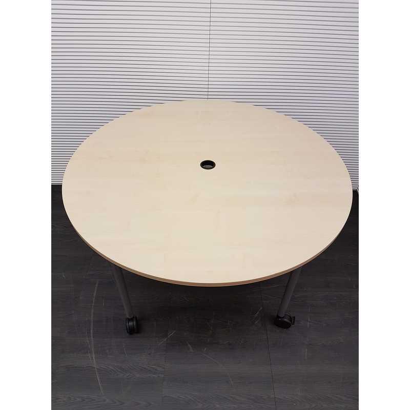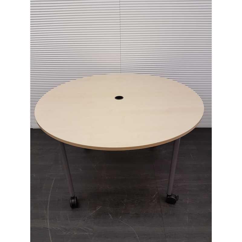 Ahrend vergadertafel rond, dm120x74cm, zilvergrijs 4poot met geremde wielen en ahorn blad met kabelgat